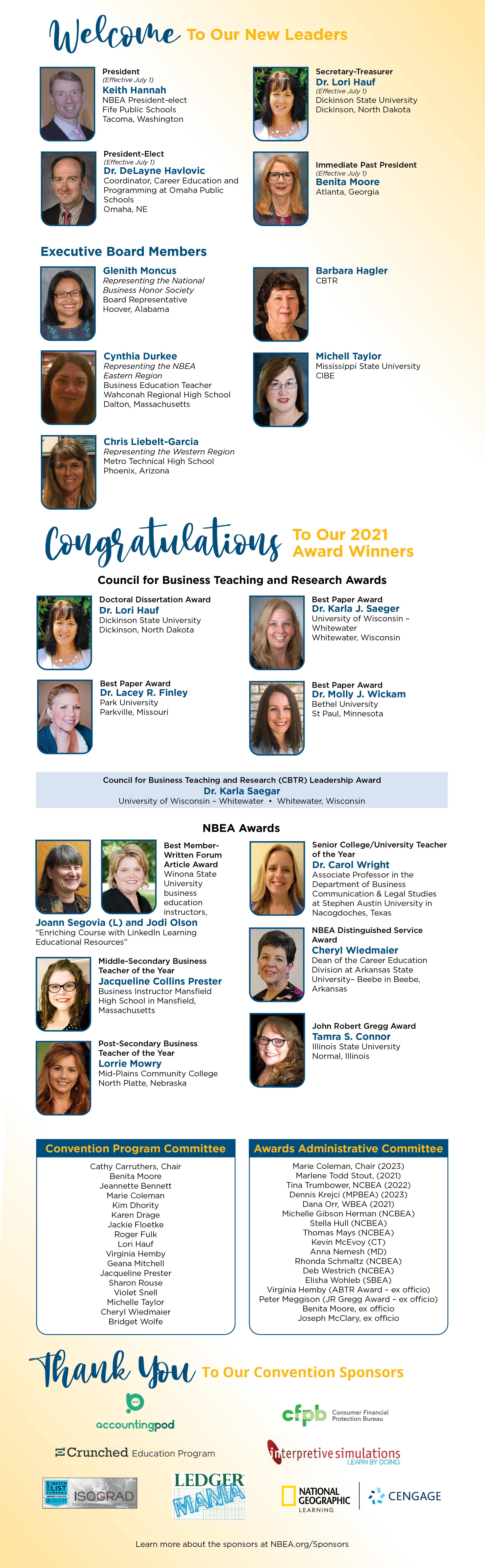 The National Business Education Association met in New Orleans, Louisiana on April 2nd to honor some of the best of the best in business education. NBEA recognizes all of the new officers, board members and award members listed below. This year's ceremony featured traditional awards for the Council for Business Teaching and Research (CBTR), teachers of the year, the John Robert Gregg award, along with a new award for Best Business Education Forum article written by a member. Award winners are listed below. NBEA would also like to thank the NBEA members on the Convention and Awards Committees who are also listed.
